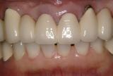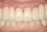 | 前歯の根が割れてしまい,抜かなくてはなりませんでした. 患者さんと相談の結果、上の前歯全てをインプラントで治療しました. どこがインプラントかわかりますか? |