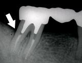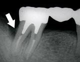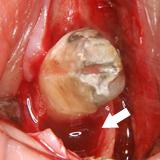 | 歯槽膿漏によって失われた骨(→印の部分)が再生しています。 | ![]() |